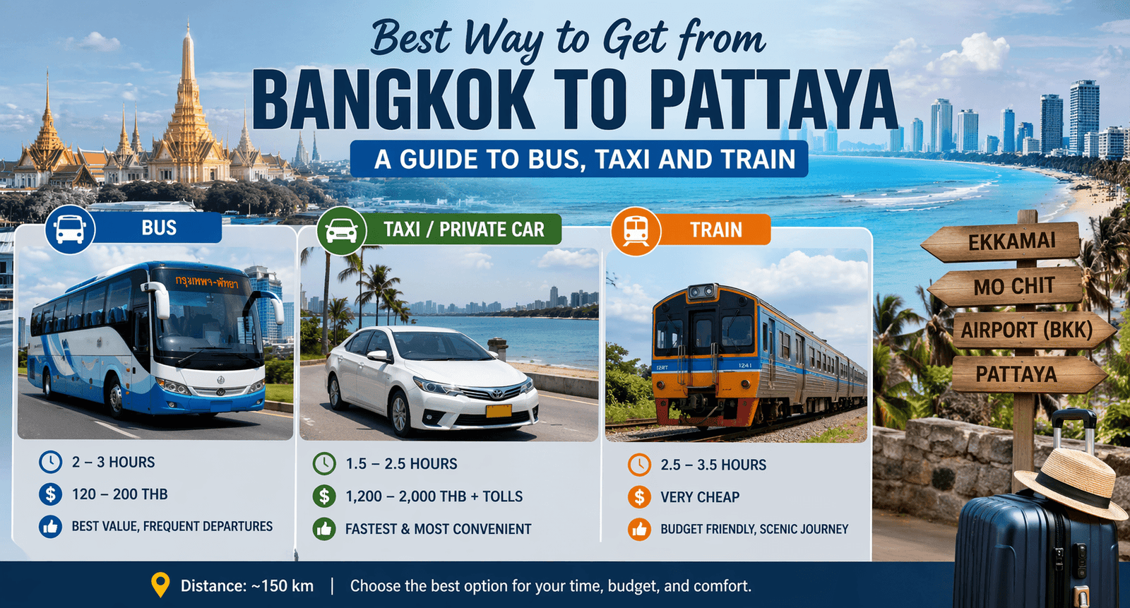Pattaya sits roughly 150 km from central Bangkok. Depending on traffic and your ride, the journey takes about 1.5 to 3 hours. Choose speed and door‑to‑door convenience, keep costs low, or strike a balance.